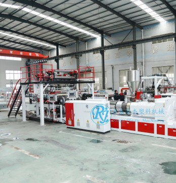 PET片材生產線是我公司結合多項生產工藝配方體系,鞏固研發出的一種免結晶干燥新型擠出片材生產線。采用精密三輥壓延工藝技術,減少了原料的粘度,提高了冷卻效率,大大提升片材的品質和產量。? 生產線由平雙擠出機,液壓換網,熔體計量泵,模具,斜三輥,定型平臺,靜電消除,表面涂油,牽引機,分割機,收卷機等。